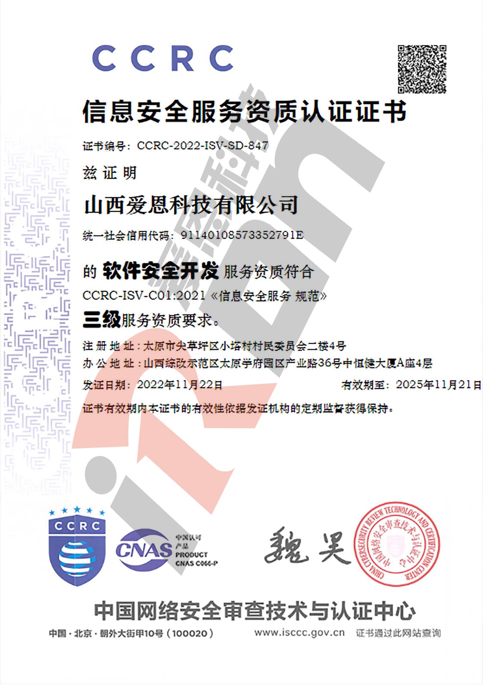CCRC信息安全服务资质认证证书