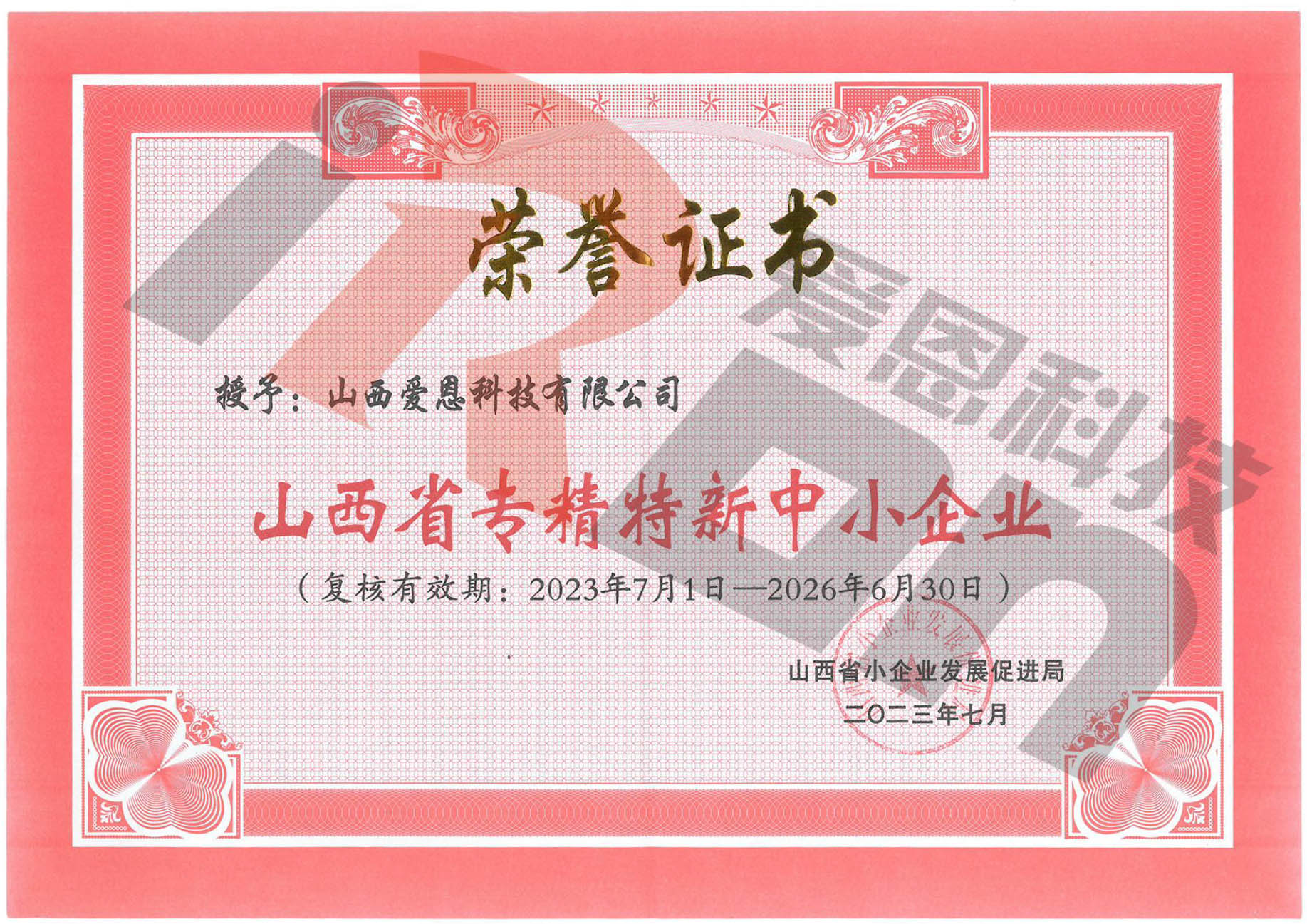 山西省专精特新中小企业荣誉证书