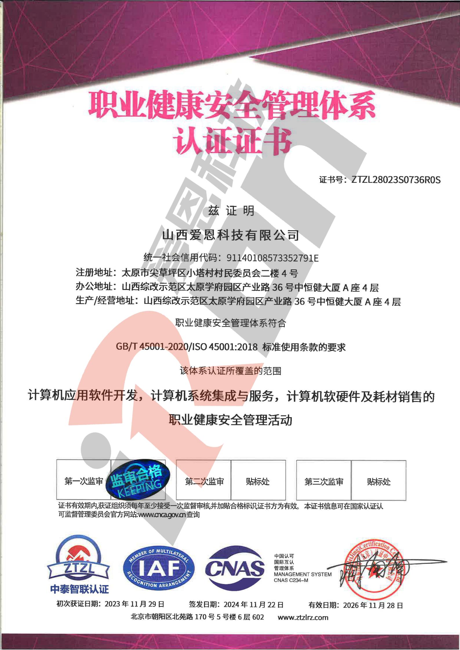 职业健康安全管理体系认证证书