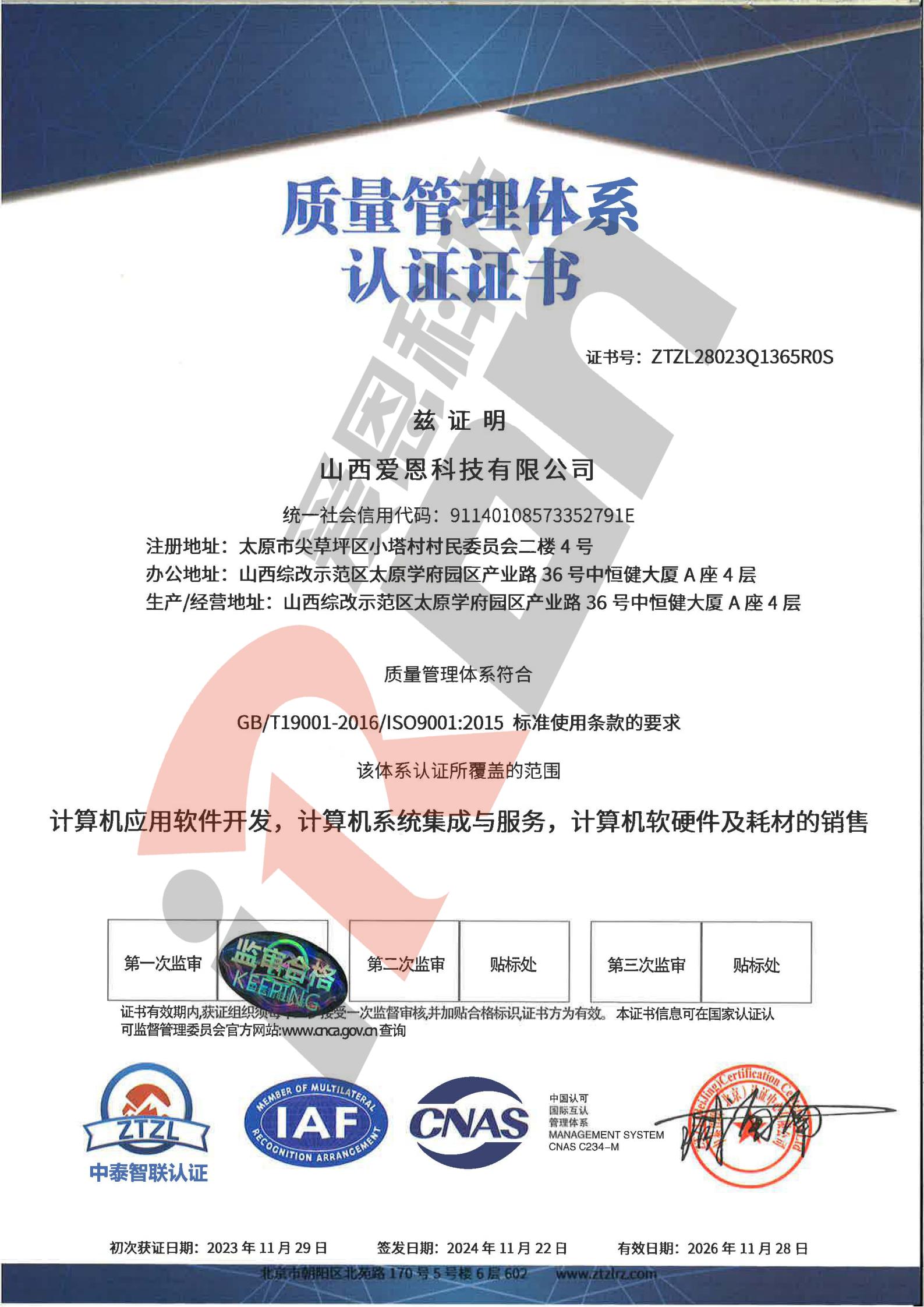 质量管理体系认证证书