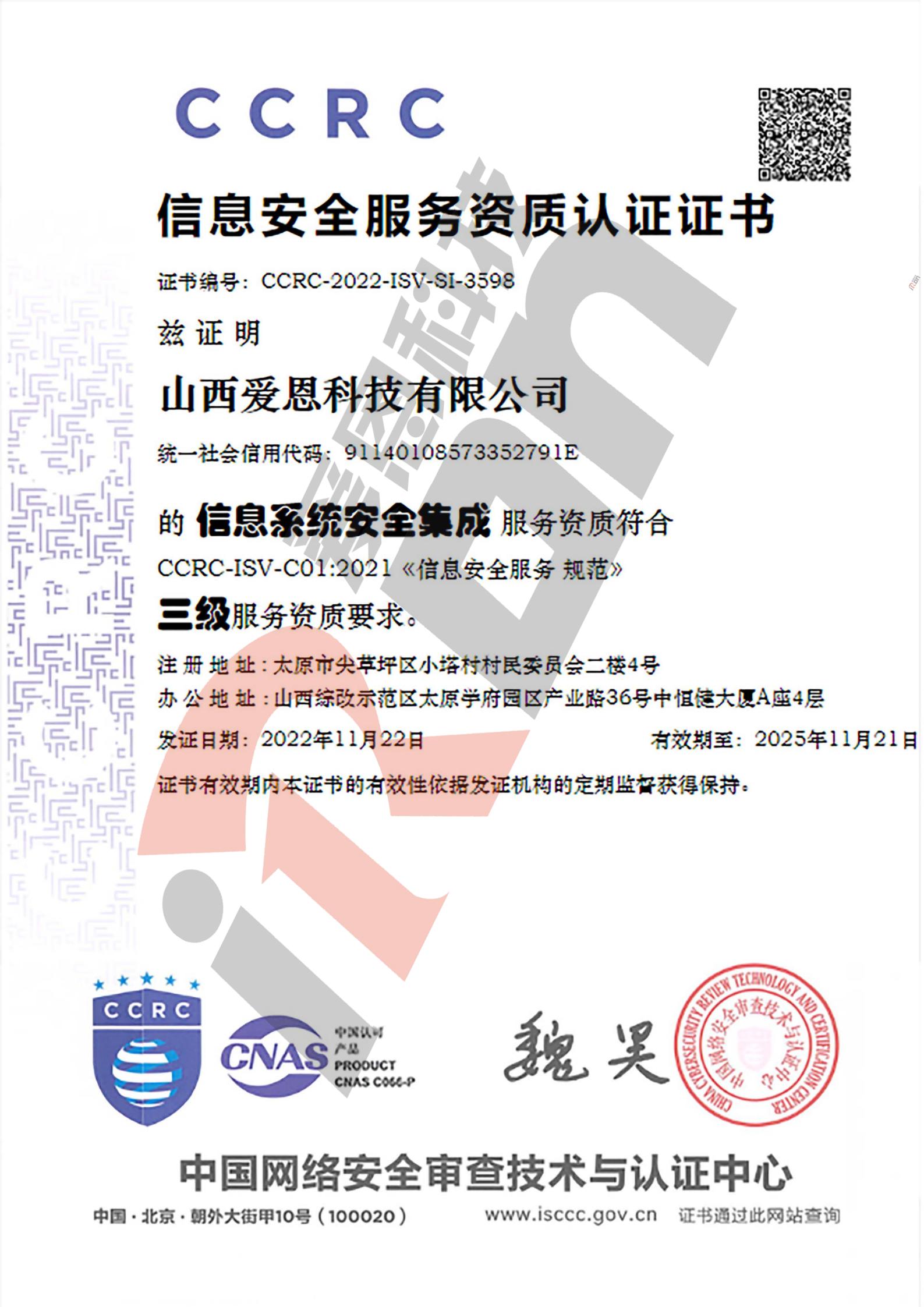 CCRC信息安全服务资质认证证书
