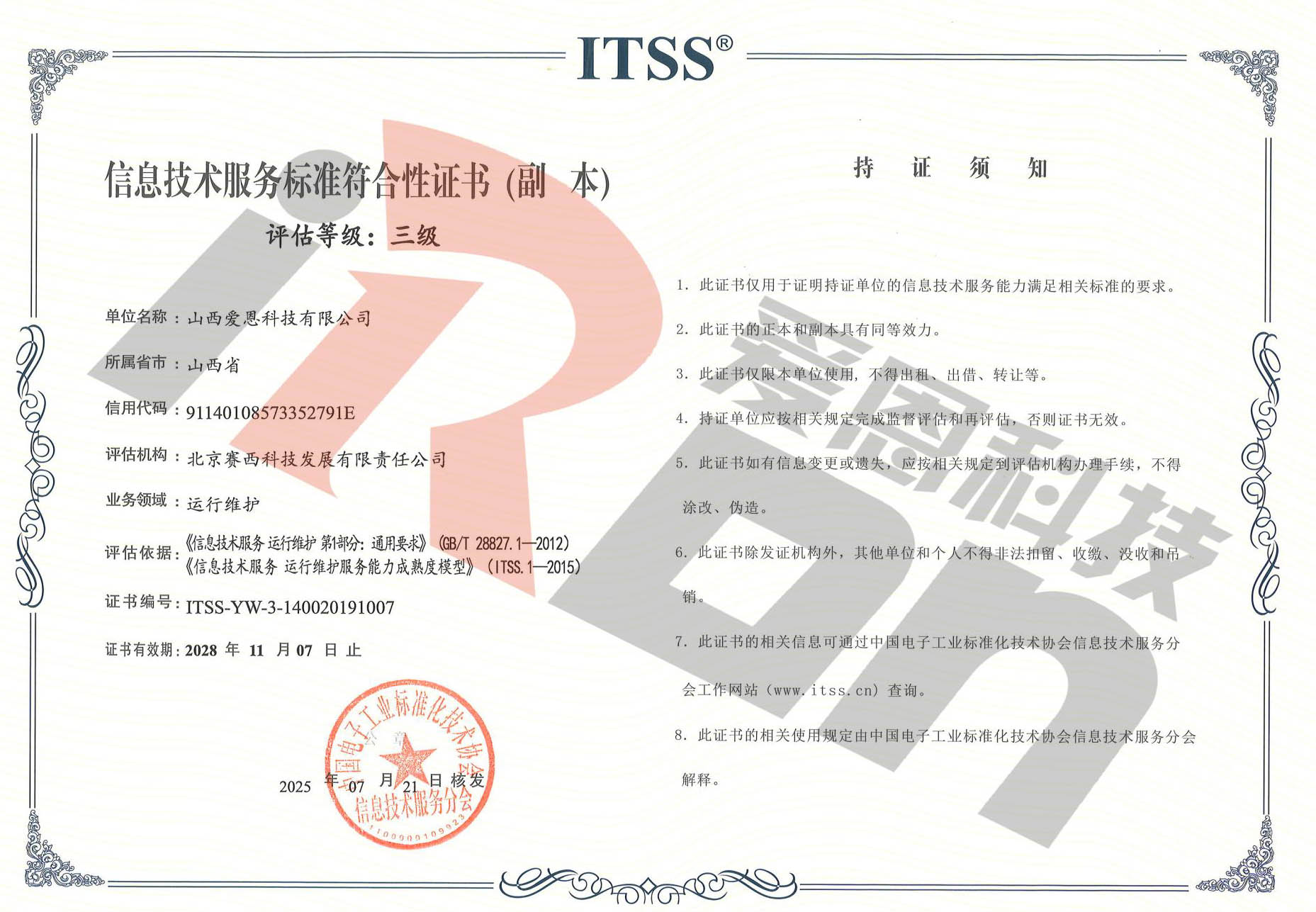 信息技术服务标准符合性证书