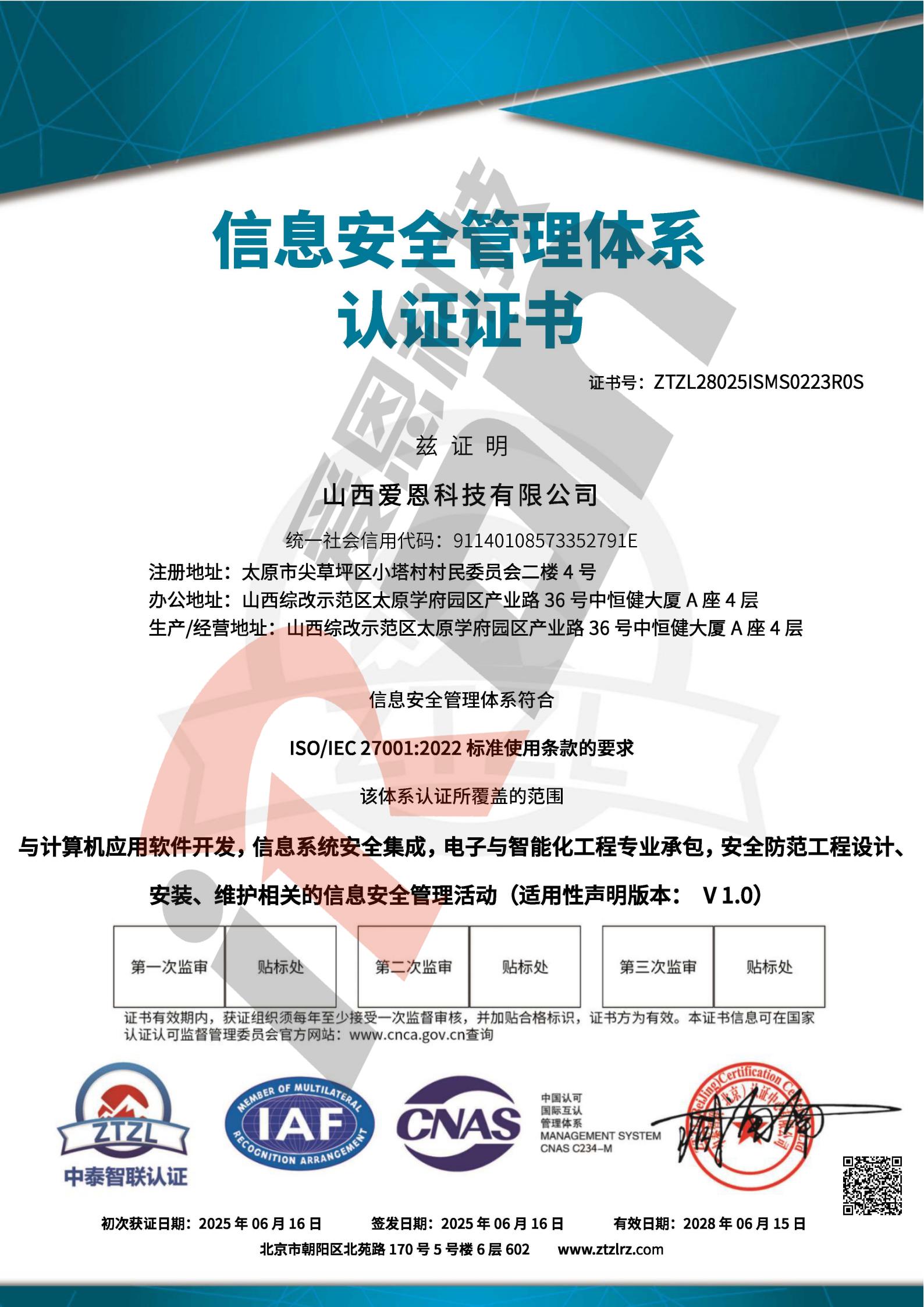 信息安全管理体系认证证书