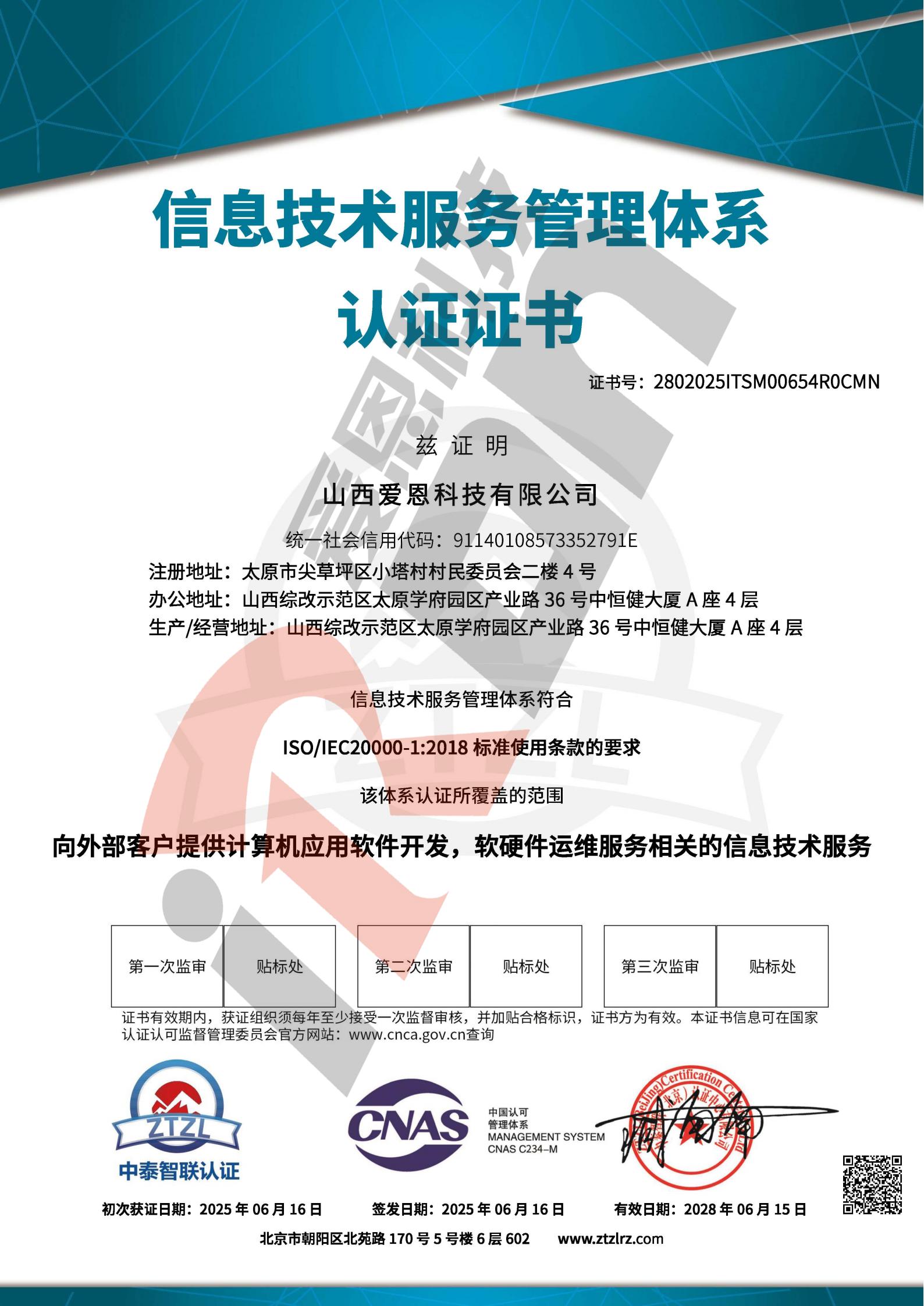 信息技术服务管理体系认证证书